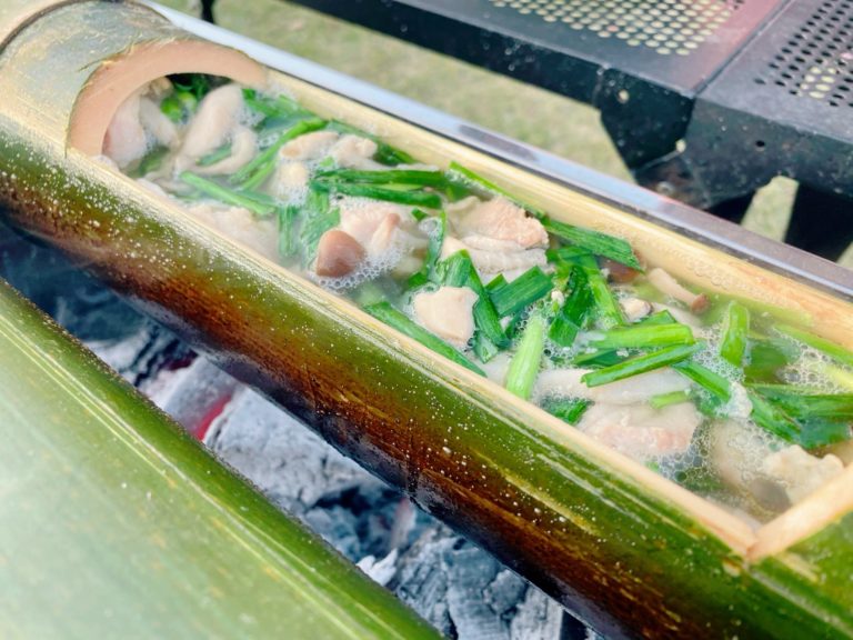 นอกจากนี้ยังมีกิจกรรมอื่นให้ทำกันอีก ที่ภูมิภาคนี้จะเรียกไผ่ว่า “Kappo” อาหารที่ใช้ Kappo หรือต้นไผ่นี้แทนภาชนะเรียกว่า “Kappo Dori” Kappo Dori เป็นอาหารที่คนท้องถิ่นเมือง Takachiho ซึ่งเป็นเมืองที่มีไผ่อุดมสมบูรณ์นั้นกินกันมาตั้งแต่สมัยก่อน และเราก็สามารถทำ Kappo Dori ที่ฟาร์มสเตย์ Chako no Yamamura Monogatari แห่งนี้ได้! ซึ่งเราจะทำตั้งแต่ตัดกระบอกไผ่ทำเป็น Kappo และใส่วัตถุดิบอาหาร เช่น เนื้อไก่ เห็ด กุยช่าย ลงใน Kappoแล้วก็นำไปย่างกินกันกับทุกคน Kappo Dori อร่อยและตอนทำก็สนุกมาก