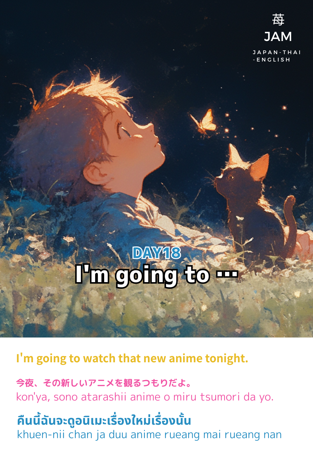 - タイ語 = คืนนี้ฉันจะดูอนิเมะเรื่องใหม่เรื่องนั้น