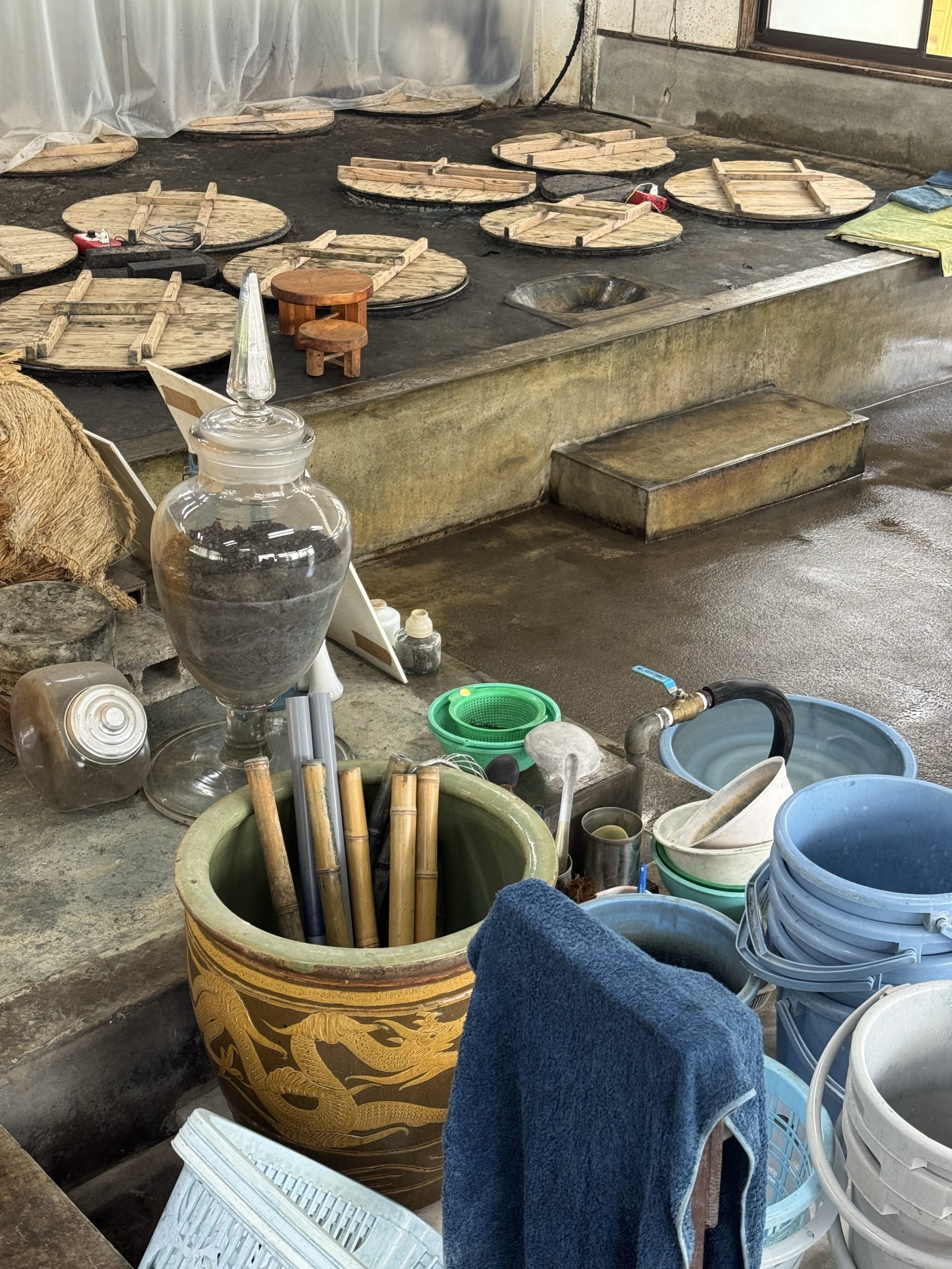 大きな甕の液面に浮く「藍の華」等、